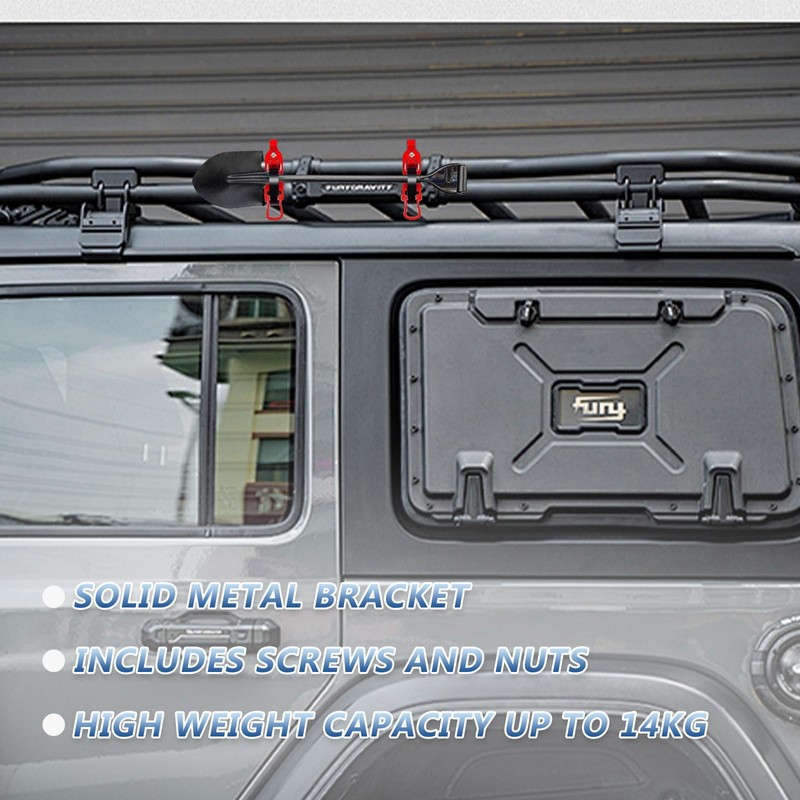 - Clamp Mounting Kit - Includes 2 red roof rack mounting brackets,4 fixing screws and 4 fixing nuts, you can install this shovel holder clamp in record time; You can mount this shovel holder for truck to a flat surface with drilling, or use the rubber clamps mounted to roof rack, cargo rack, bumper or bed rack.