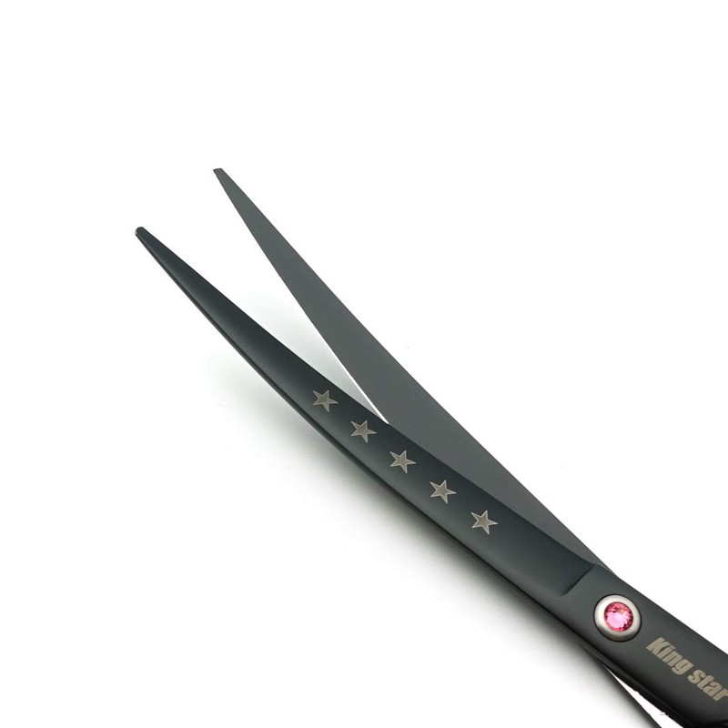 - SHARP EDGE. The edge line of the blade is evenly polished,which make the scissors durably sharp.With meticulously crafted clear tip of tooth ,the thinning scissors are sharp and do not clip the hair.The edge of the curved scissors is 25°-30°,majority standard angle to satisfy most part of groomers.
