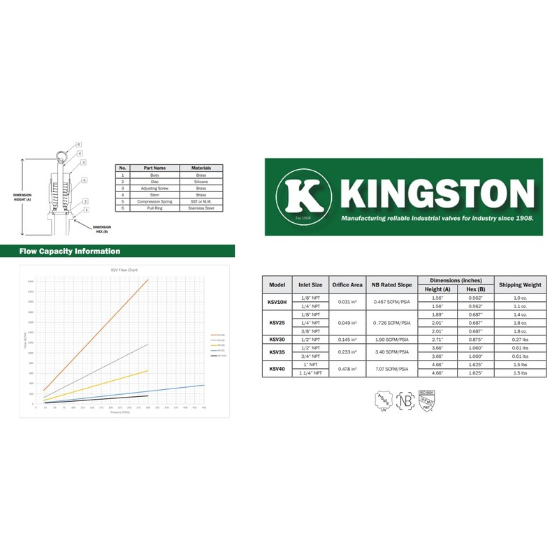 Kingston 1/4” NPT Brass Soft Seat Industrial Pressure Relief Valve, Made In The USA. (390 PSI / 322 SCFM)