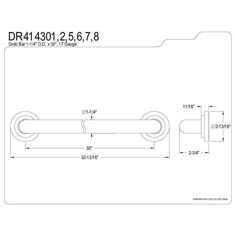Fabricated from solid brass material for durability and reliability, 1-1/4" gripping surface on grab bar, Easy to install, 1-1/2" (38mm) wall clearance meets ADA standard, Mounting hardware included (2" x#8 Philips Head Screw. Total 8pcs), 30" overall length, 1-1/4" outer diameter, One Year Limited Warranty to the original consumer to be free from defects in material and finish.