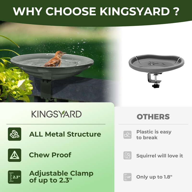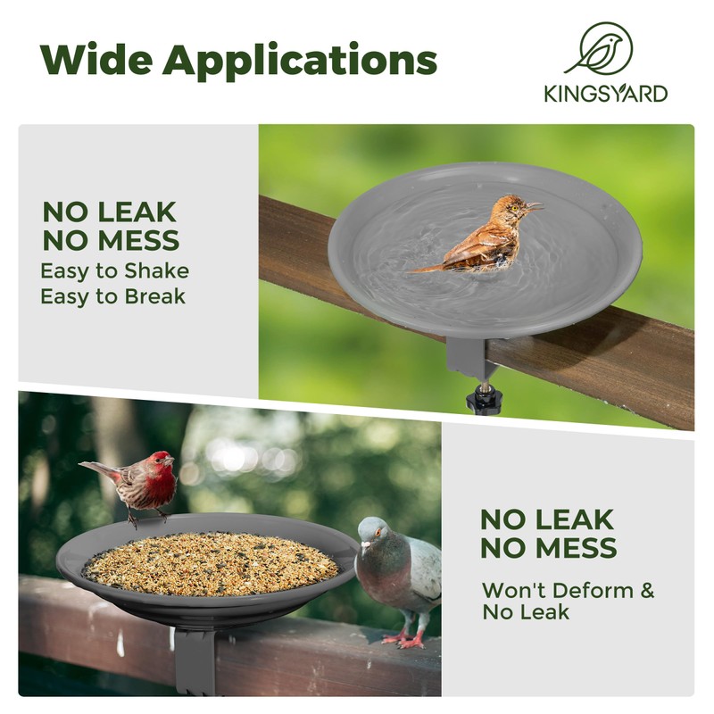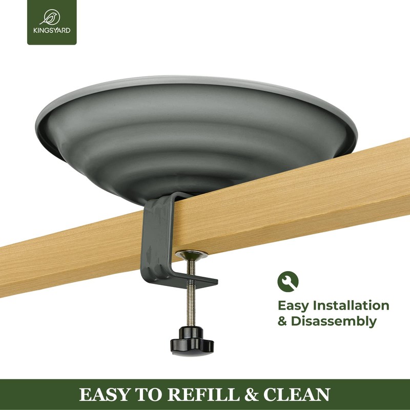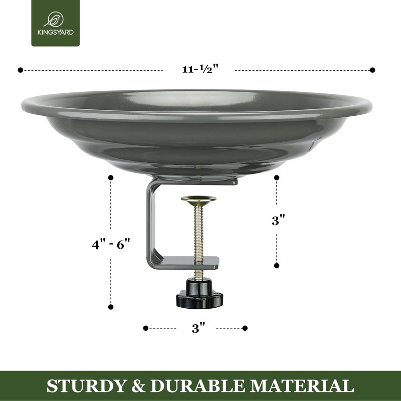 - 【Easy Installation & Removal】No tools required. Deck mounted bird bath comes with an adjustable clamp that fits to decks up to 2.5 inches thick. Durable metal bowl detaches from the clamp for easy cleaning and filling.
