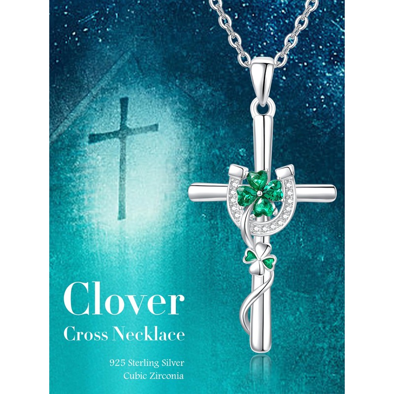 KINGWHYTE Four Leaf Clover Necklace Cross Necklace 925 Sterling Silver Horseshoe Necklace Emerald Crystal Pendants For Women Shamrock Irish Jewellery St Patricks Day For Women