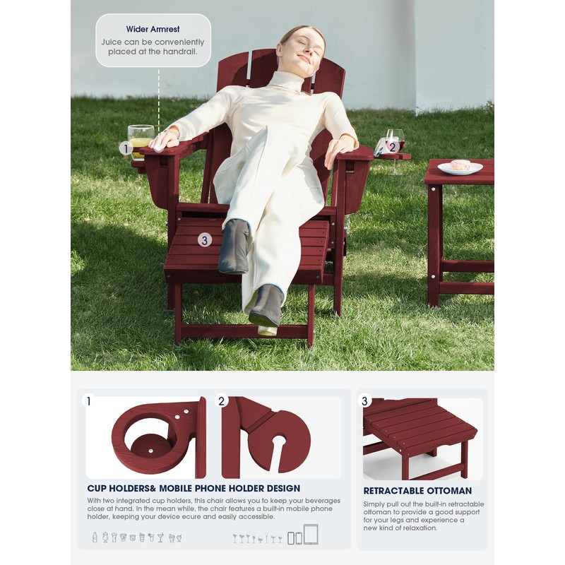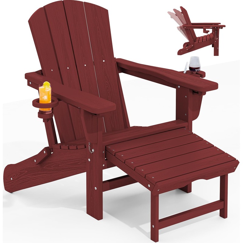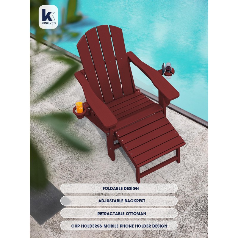 - Ottoman & Cup Holder Included- The matching retractable ottoman perfectly complements the Folding Adjustable Adirondack chair's design, while the chair comes with two cup holders under the armrests. KINGYES Versatile Adirondack chair is designed to suit your outdoor need. Relax on your deck or patio with your favorite beverage in the cup holder.