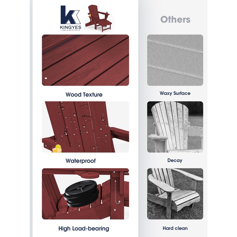 - All Weather Use Finish- KINGYES Versatile Adirondack Outdoor Chair is made of high-density polyethylene material for a sturdy, KINGYES fade-proof Chair ensures long-lasting use even in a variety of outdoor conditions.