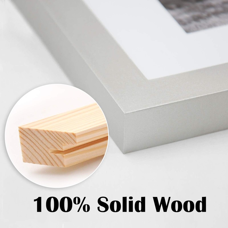 • MATERIAL:Kinlink 11x14 photo frames are fitting for pictures 5x7/8x10 with mat and standard pictures 11x14 without mat. These 11x14 silver wood frames are made of high-quality light weight solid wood with transparent acrylic glass front that gives a clear view of your picture and preserves your precious memories as well. It is worth noticing that remove the protective film on the glass before use.