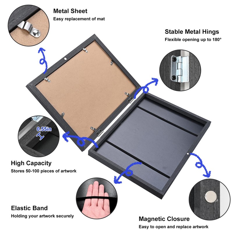 - CHANGEABLE DISPLAY: With these frame for kids artwork changeable, you can easily change the artwork on display without having to open up tabs on the back. These wood childrens art frames with storage could be opened and closed easily like a book. Designed with a small magnet, the kid picture frame with storage will be closed firmly for better storage. Children can operate alone with opening and closing safely.