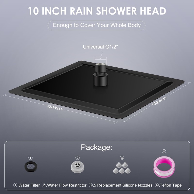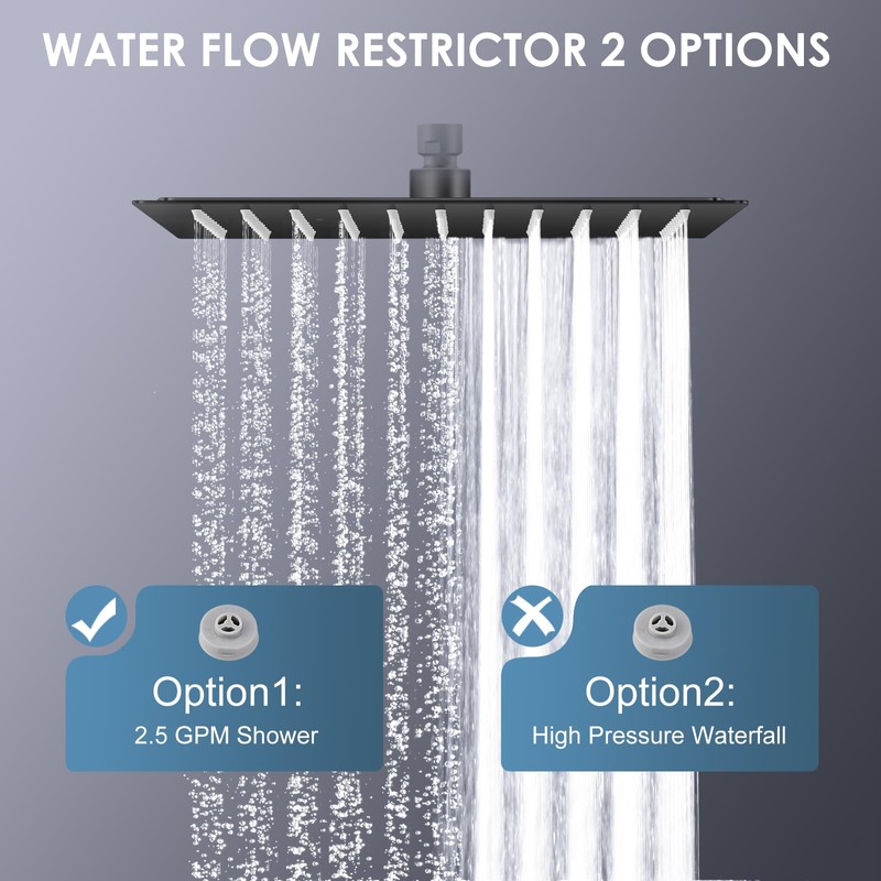- RAINFALL SHOWER HEAD - The 10 inches Square bathroom waterfall showerhead ceiling or wall mount, engineered with ultra-thin design and innovative air-in technology, feeling you a ultimately spa shower. With the included flow restrictor, experience a gentle 1.8 GPM rainfall, or remove it for a higher pressure waterfall shower, catering to your preferences.