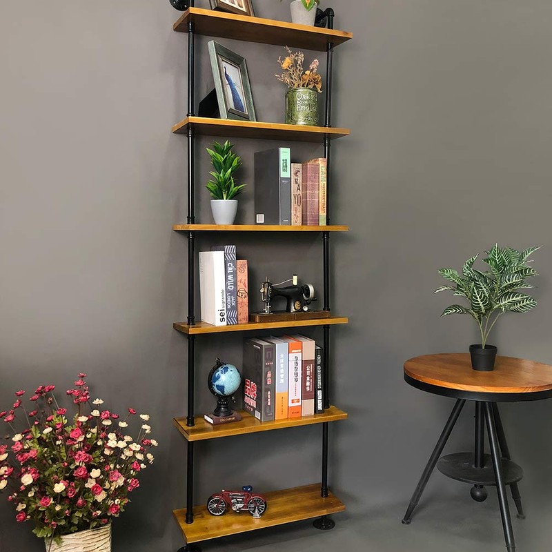 KINMADE Industrial Pipe Shelf Wall Shelf Rustic Wood with Black Iron Pipe 6 Tier
