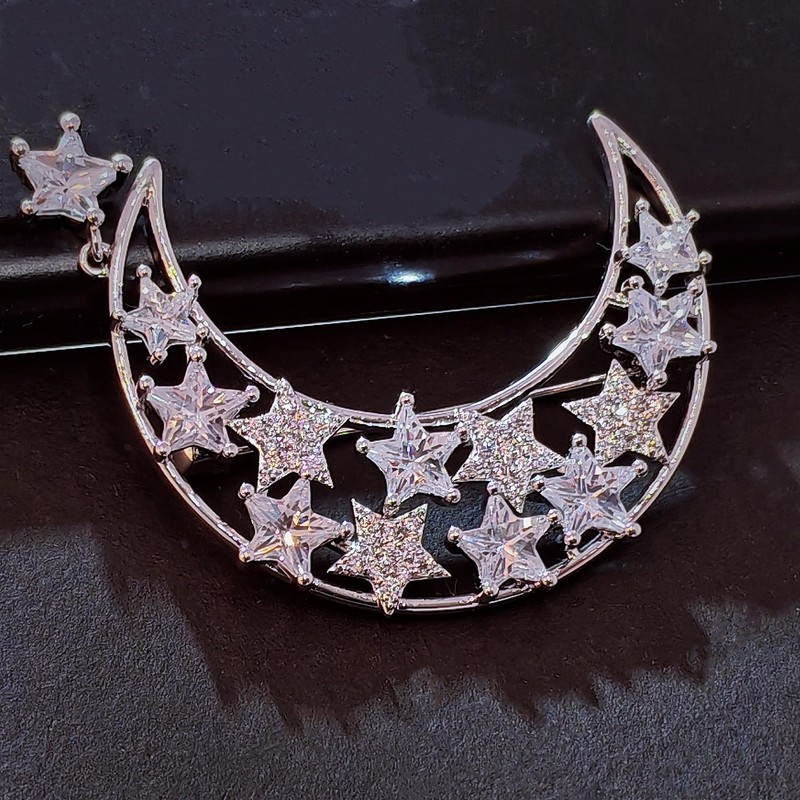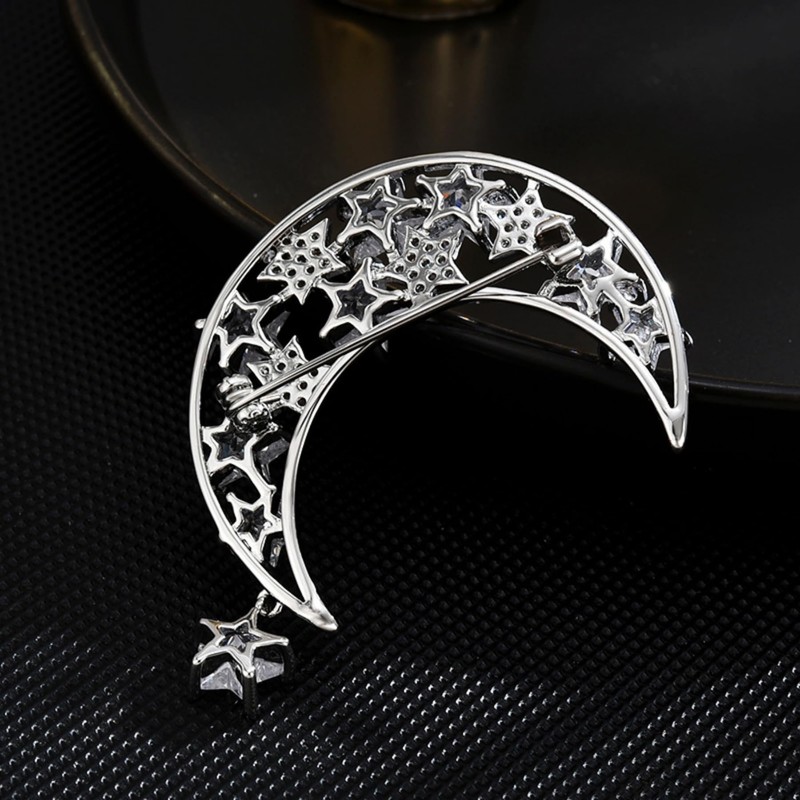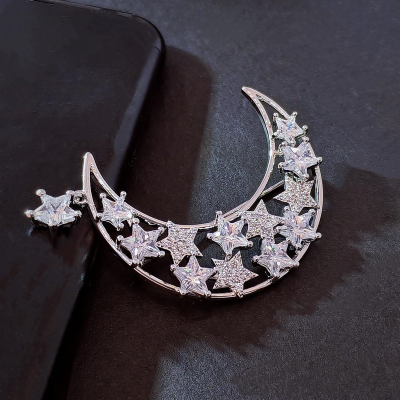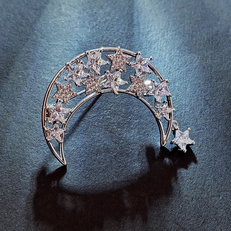 - This exquisite brooch, featuring a lustrous crescent moon adorned with stars, is crafted in a gleaming silver tone. The openwork design of the moon is embellished with two distinct styles of stars: one set is encrusted with tiny, clear micro-pavé cubic zirconia, while the other showcases elegant baguette-cut cubic zirconia in a prong setting, creating a chic two-tone effect. A delicate star charm dangles gracefully from the moon's tip, enhancing the piece's sparkle.