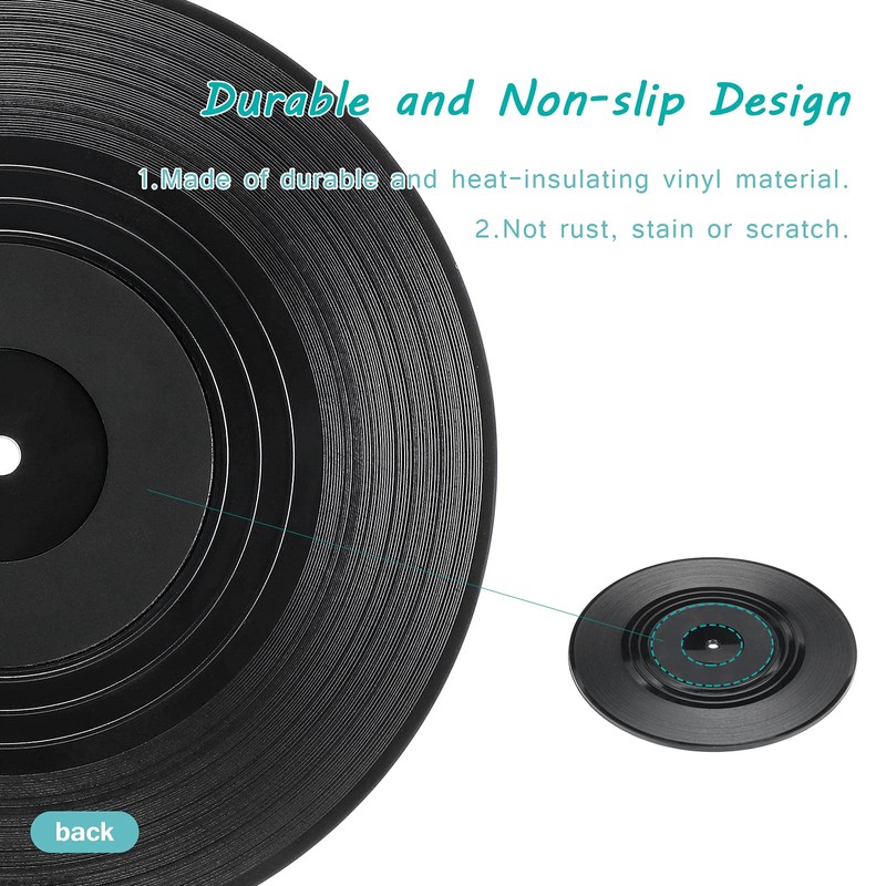 - Non-slip design: retro vinyl record coasters made of non-slip, insulated, food-safe plastic. Ideal for protecting wood or glass surfaces from traces of your cups or tableware.
