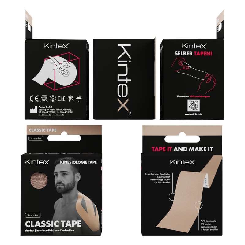- Kintex Kinesiology tapes are developed in professional sports and with physiotherapists. You can also tape yourself. Use our over 40 video instructions, such as applying the tapes for knees, arms or as lymphtape.