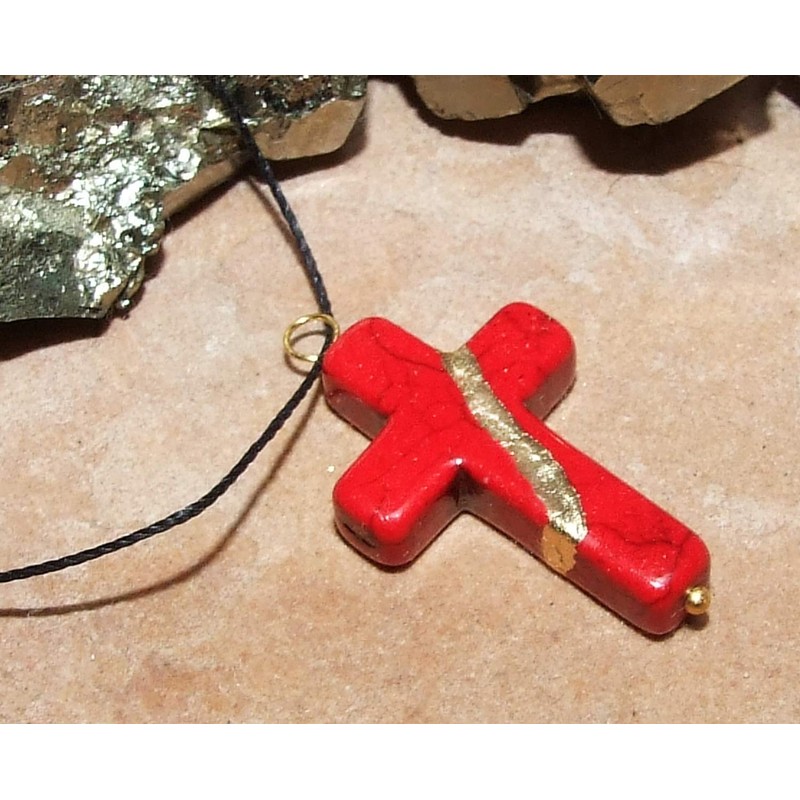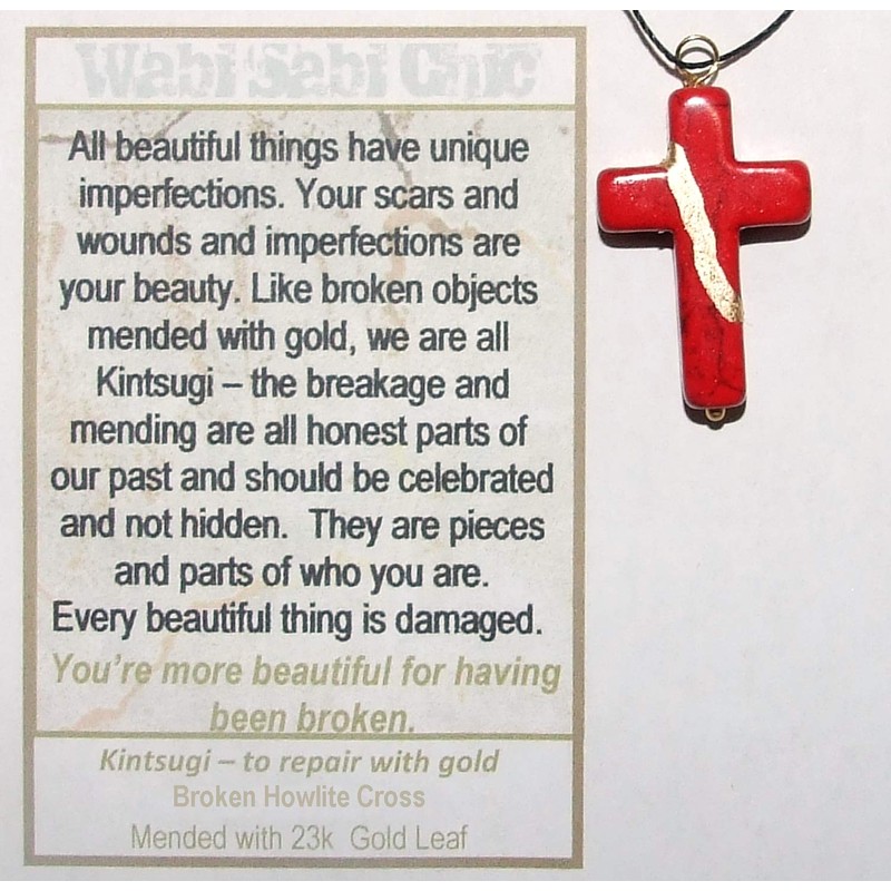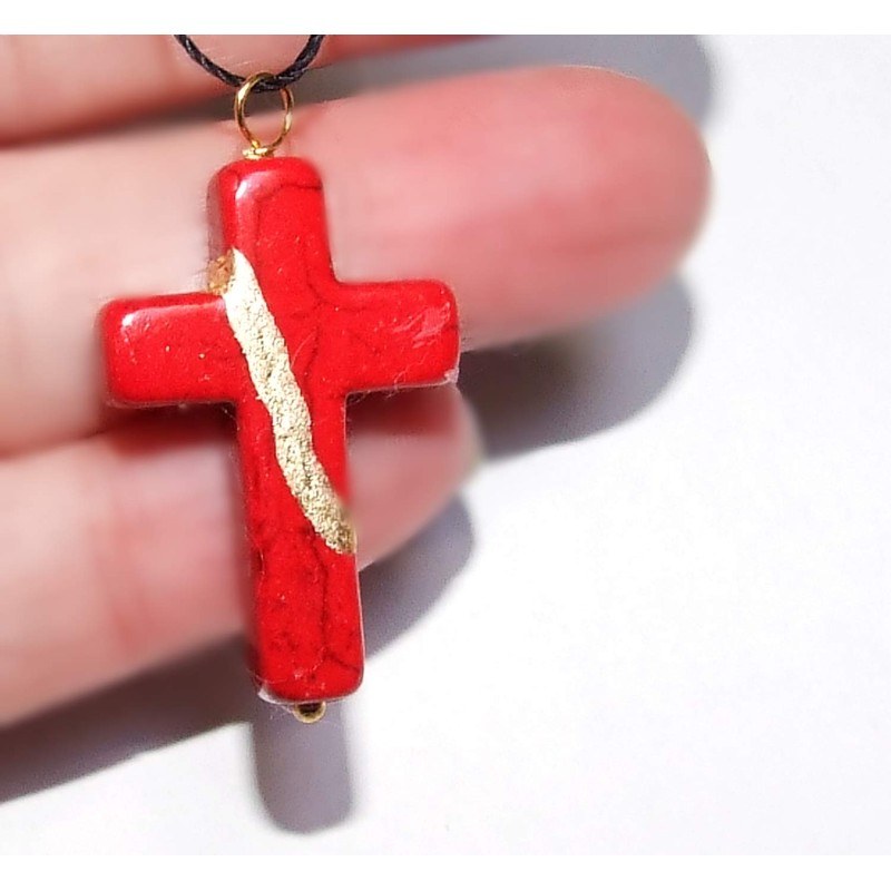 PENDANT: Red Howlite, which looks just like red Jasper although it's another mineral--Howlite. The cross is 1-1/8" long (28mm) 3/4" (20mm) wide and is 1/4" thick (6mm).. It is broken then mended on all sides as shown, using the Kintsukuroi technique and finished with genuine 23k gold leaf. Smooth and polished.