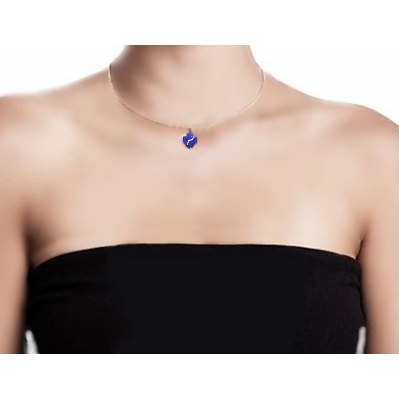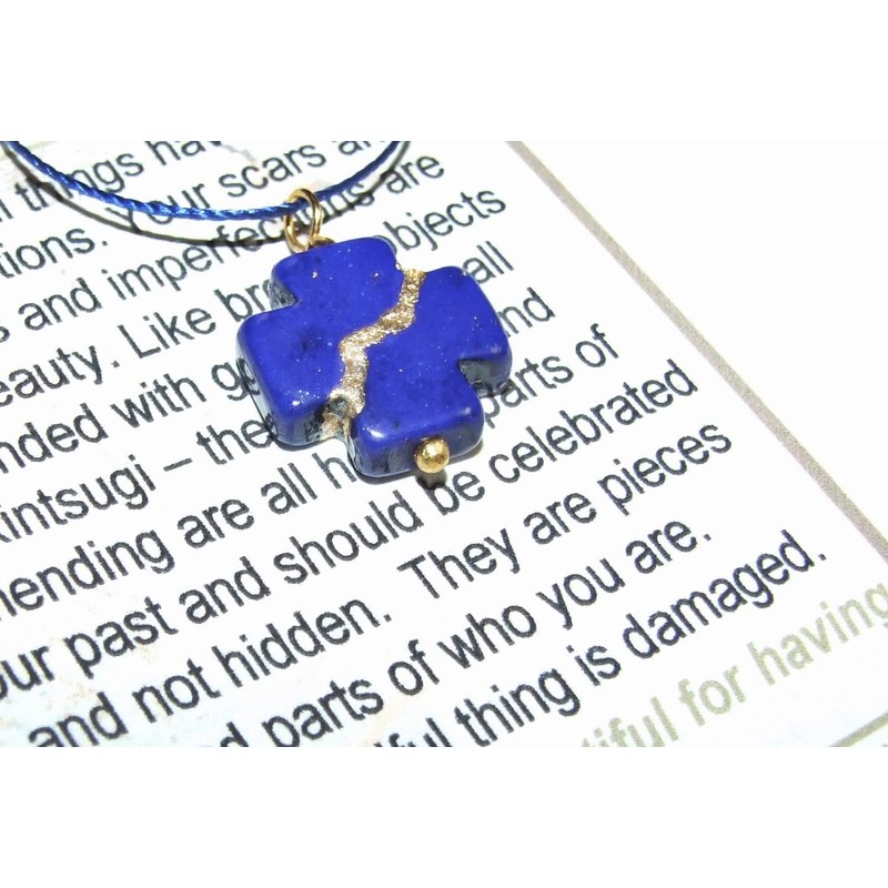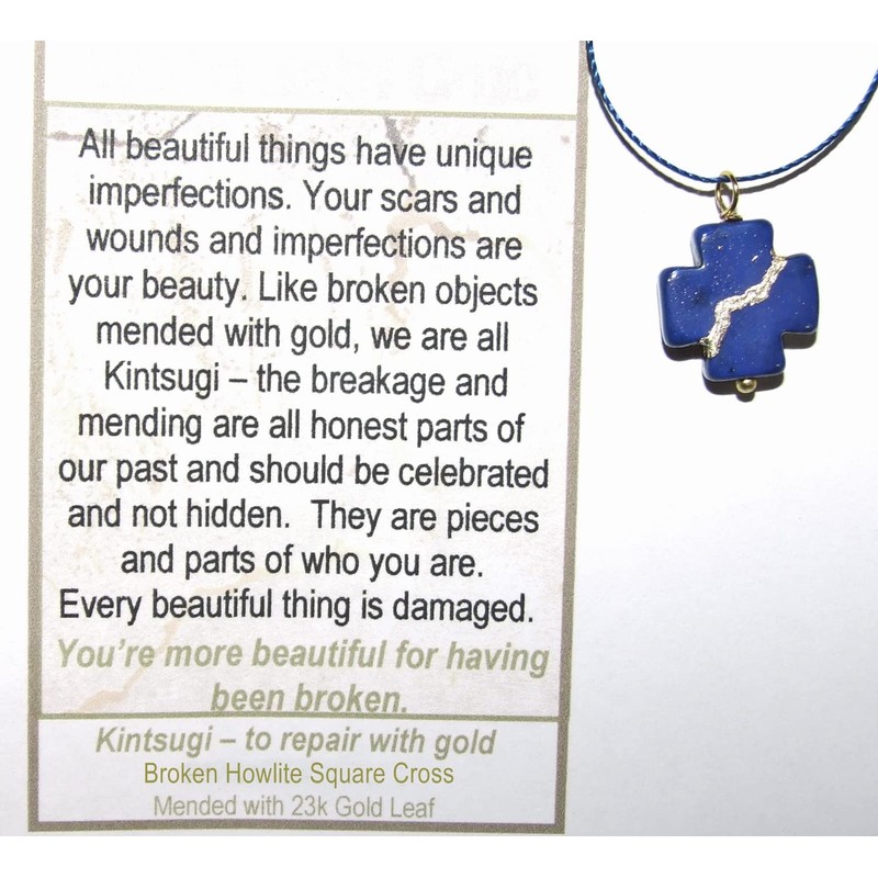 A beautiful dainty 16mm smooth kintsukuroi "mended square cross" rich blue howlite pendant has been simply hung on a silky soft yet unbreakable silk-like cord. It feels smooth and cool against the skin.