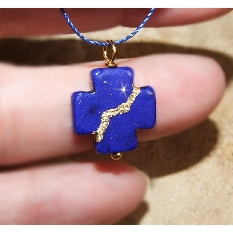 PENDANT: Lapis-Blue howlite. The dainty cross is 16x16mm (5/8") and is 4mm thick. It is broken then mended on all sides as shown, using the Kintsukuroi technique and finished with genuine 23k gold leaf. Smooth and polished.