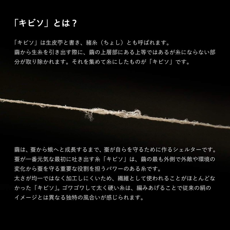 • What is Kibiso? "Kibiso" is a thread that only takes about 4% from a single cocoon. Silkworm is the first thread to dispense cocoon. Although it contains a lot of protein "sericin", a moisturizing ingredient of silk, it is thick and hard, and it is difficult to work as a fiber; it has been rarely used until now. But this time, we have successfully made it as a fiber