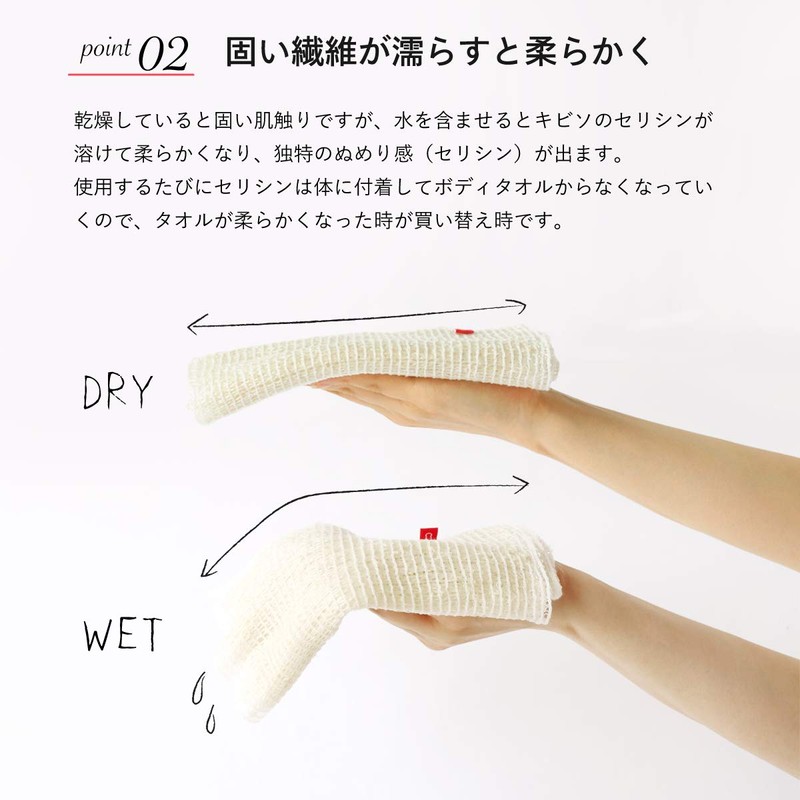 • (Soft when the hard fiber gets wet) It feels hard to the touch, but if you add water, the sericin adhering to the kibiso melts and softens and creates a unique warm feeling from sericin. Each time you use the sericin will adhere to your body and lose it from the body mitt, so when the mitten becomes softer, it is time to replace it