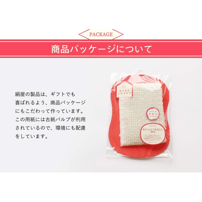• (Silk-rare, "Kibiso" body mittens) Kibiso contains a rich variety of water-soluble protein sericin, which is said to have excellent moisturizing power and antioxidant properties. When you wash your body with a Kibiso body mitten, sericin will stick to your skin for a moist wash