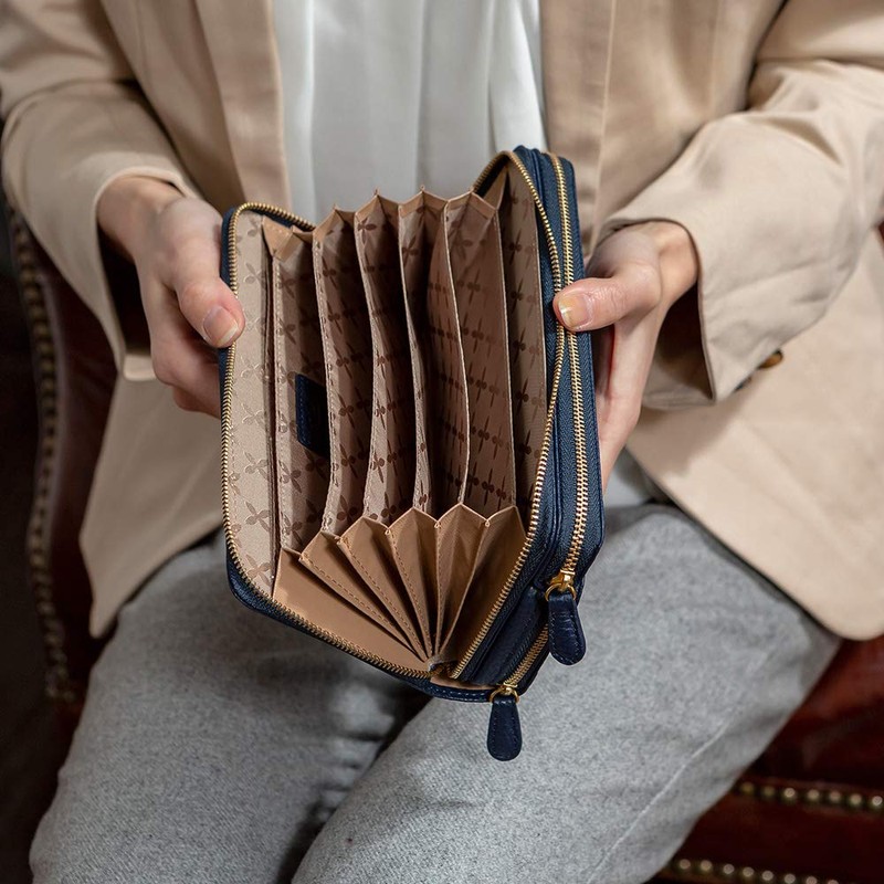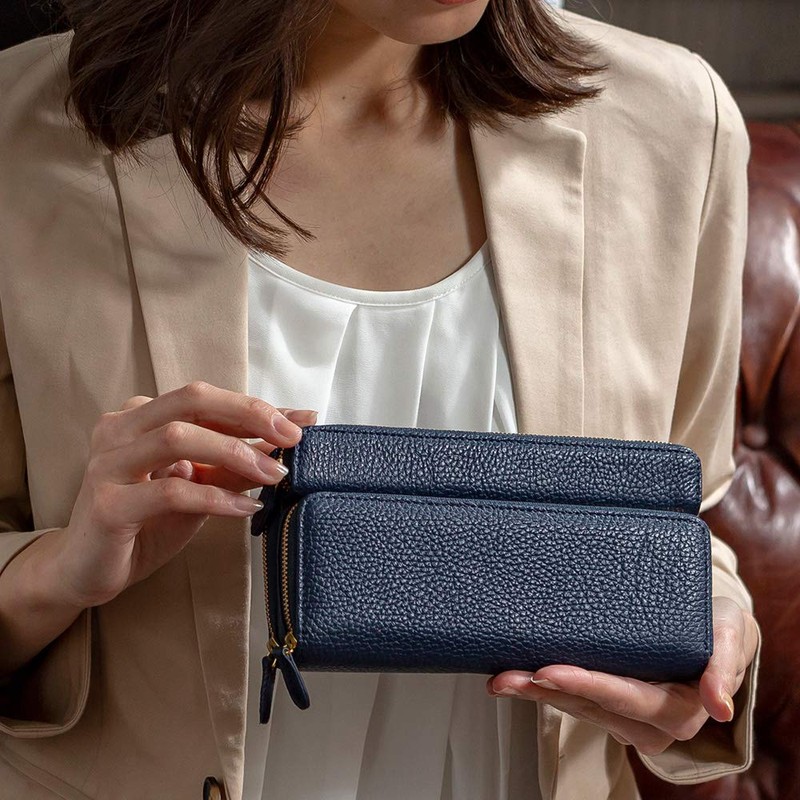 Kiotchiola Women's Long Wallet, Italian Leather, 3-Layer Long Wallet, Round Zipper, Genuine Leather Wallet, navy