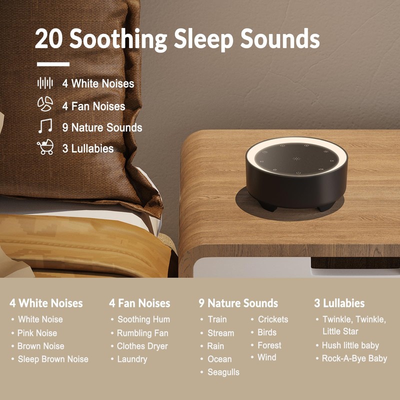 - High-Fidelity Soothing Sounds: Features 20 high-fidelity soothing sounds including 4white noises, 4 fan noises, 9 nature sounds, and 3 lullabies. You can choose your favorite sound by simply tapping the sound name. Perfect for babies, and adults help you relieve the stress at home or office.