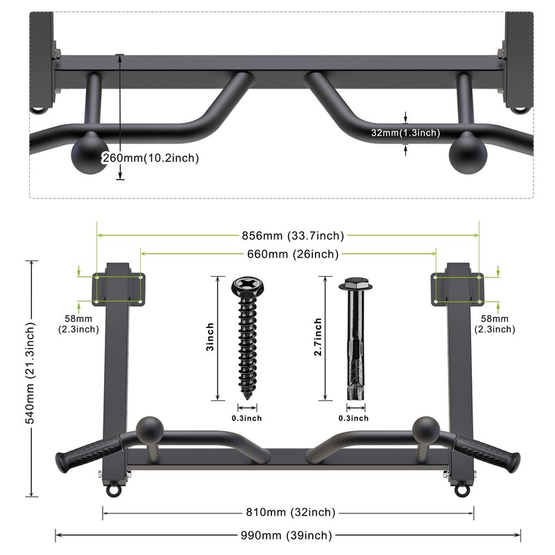• HEAVY DUTY CHIN UP BAR: The joist mounted pull up bar is made of heavy steel pipes, with black electrophoretic coatings, excellent durability, ruggedness and corrosion resistance. Max load-bearing 400lbs.