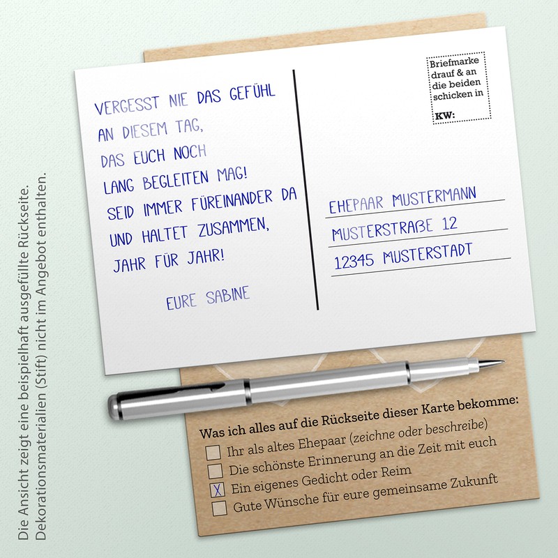 Each card has a field on the back where the game manager registers the calendar week (KW) in which the card is to be sent to the wedding couple.