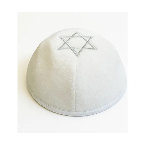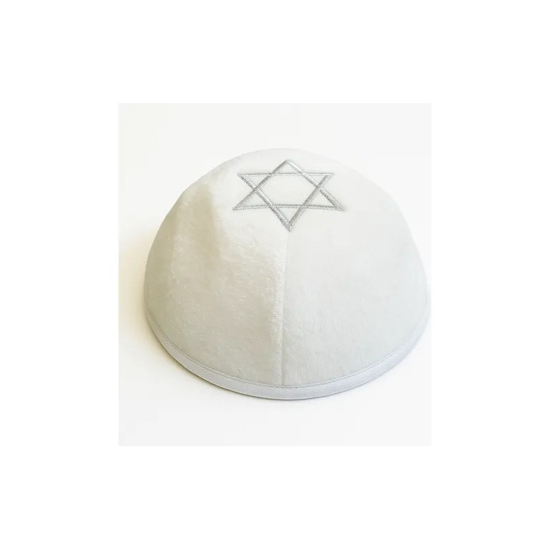 Elegante kippa blanca ideal para novio, confeccionada con tela aterciopelada suave al tacto. Tiene un diámetro de 16 cm, perfecta para eventos religiosos como bodas o ceremonias formales. En la parte superior lleva una estrella de David bordada en hilo plateado, añadiendo un toque tradicional y distinguido. Ligera, cómoda y con excelente terminación.