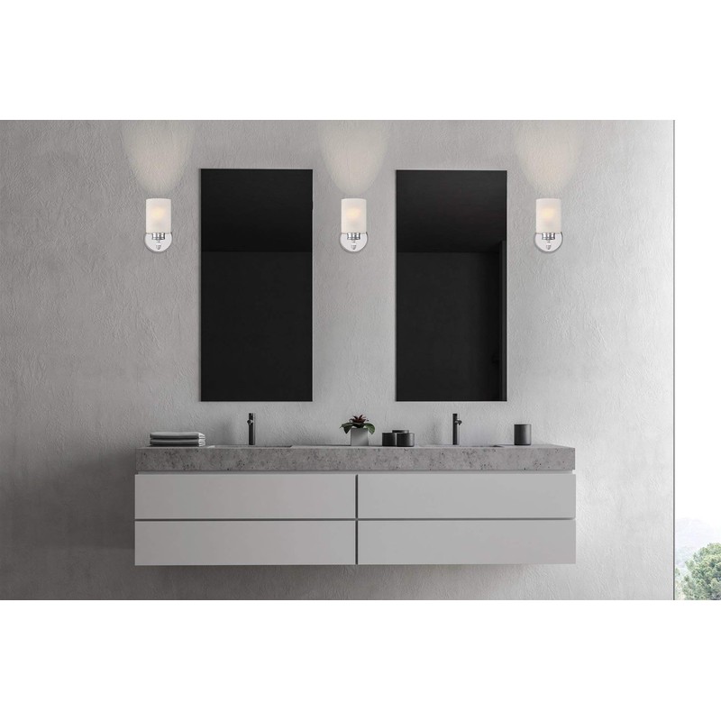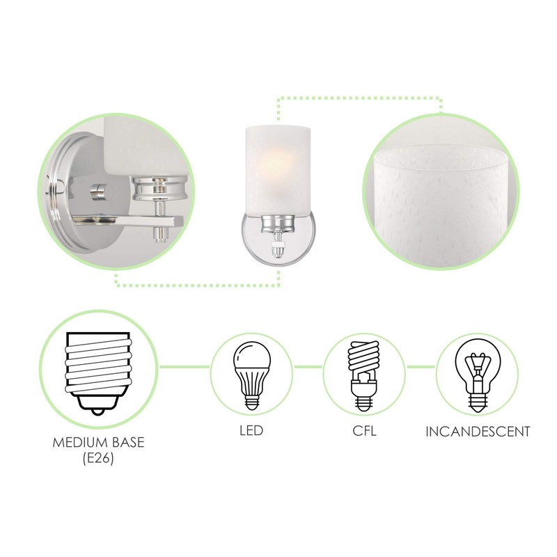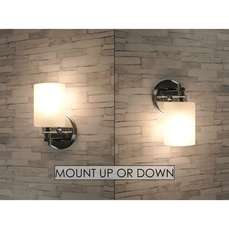 - MINIMALIST STYLE: Simple, elegant sconce emits a gorgeous glow through cylindrical glass. The frosted, seeded shade sits upon a sleek, chrome frame. Brighten any area with its versatile ability to hang facing in an up or down direction