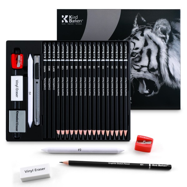 Kird Barken 24PCS Professional Sketch Pencil Set – 5H to 14B Pencils, Charcoal Pencils, Art Supplies Kit with Erasers, Sharpener, Knife – Ideal Gift for Artists, Students, Kids, Beginners