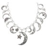 - Oval link chain; various sizes of moon charms with aurora borealis crystals, including black, clear, pink, and blue; purple epoxy enamel accents; oxidized finish
