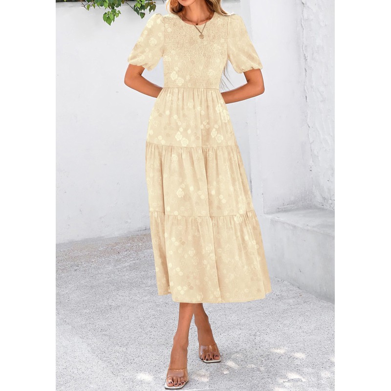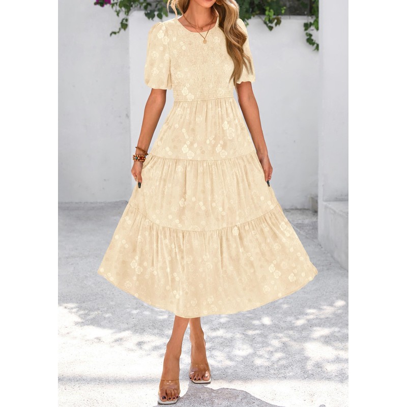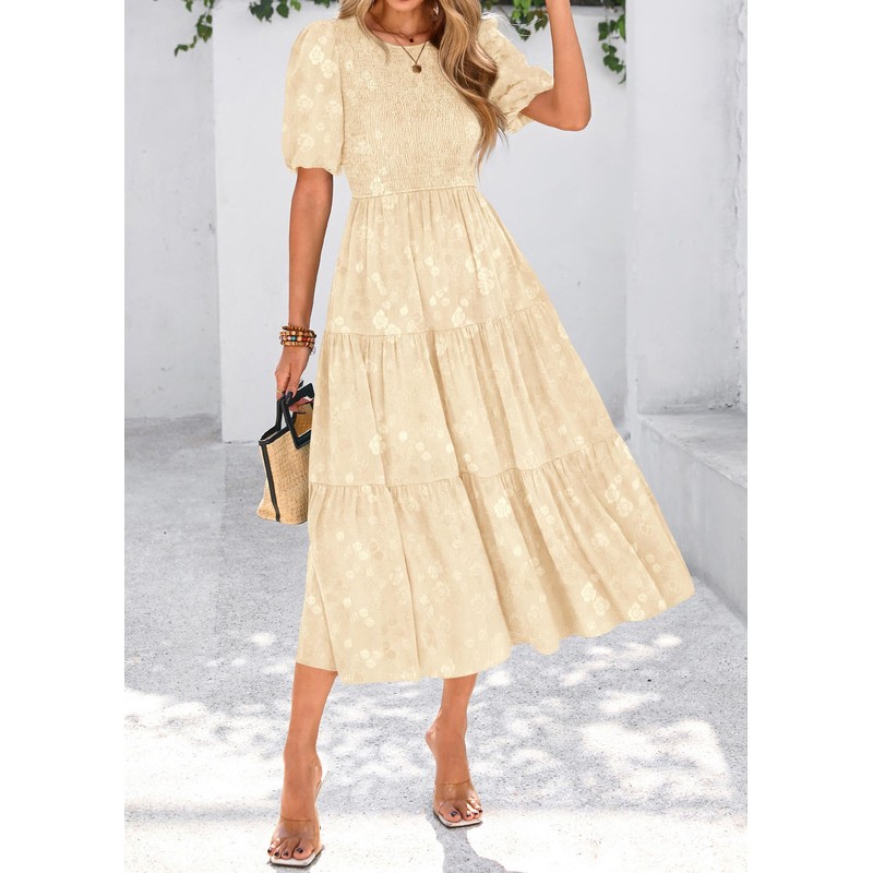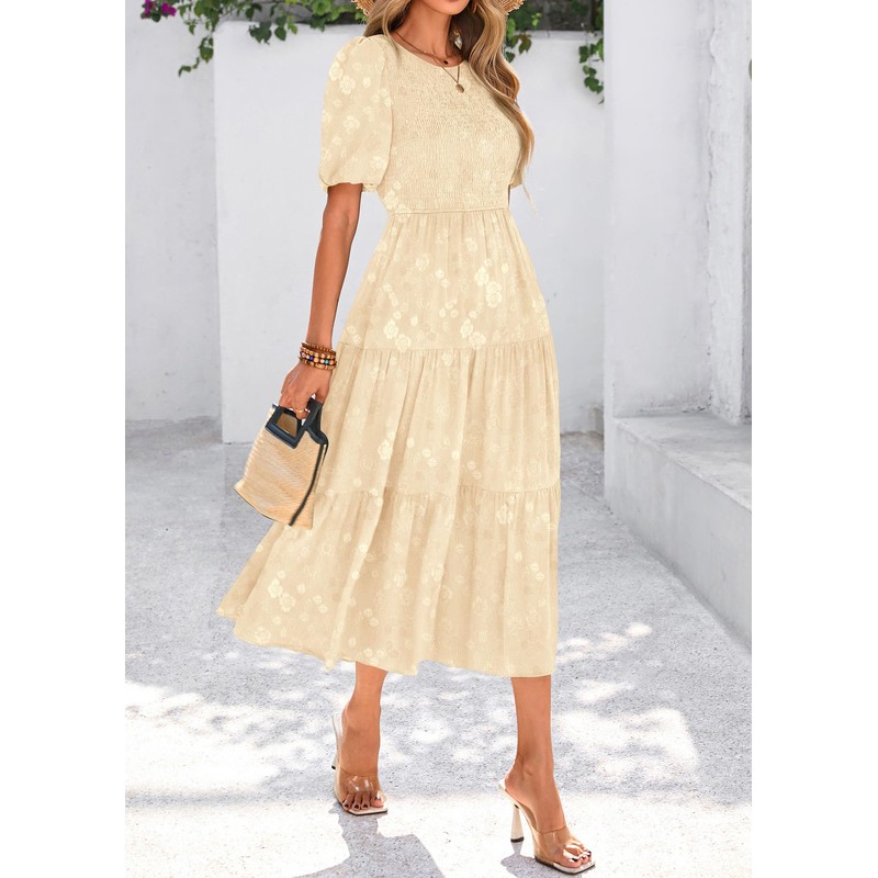 - Highlights: Midi Smocked Dress Women With Elegant A-Line Style And Chic Crew Neck Design, Makes It An Essential Part Of Any Trending Women's Clothing Collection. Feel Confident And Effortlessly Stylish In This Short Sleeve Dress, Designed To Accentuate Your Waistline And Highlight Your Natural Beauty