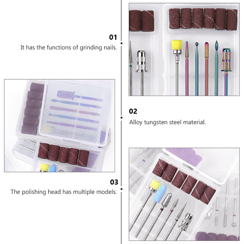 Nail Drill Bits for home, office and other special occasions.Polishing Machine Nail Tool The grinding heads set are nail art tools that are applicable for nail drill machine.Nail Grinding Headset Tool This simple but tool set is nice nail grinding heads, these grinding heads are sturdy and use.Alloy Nail Drill Bits Light weight and won't take too much space for storage