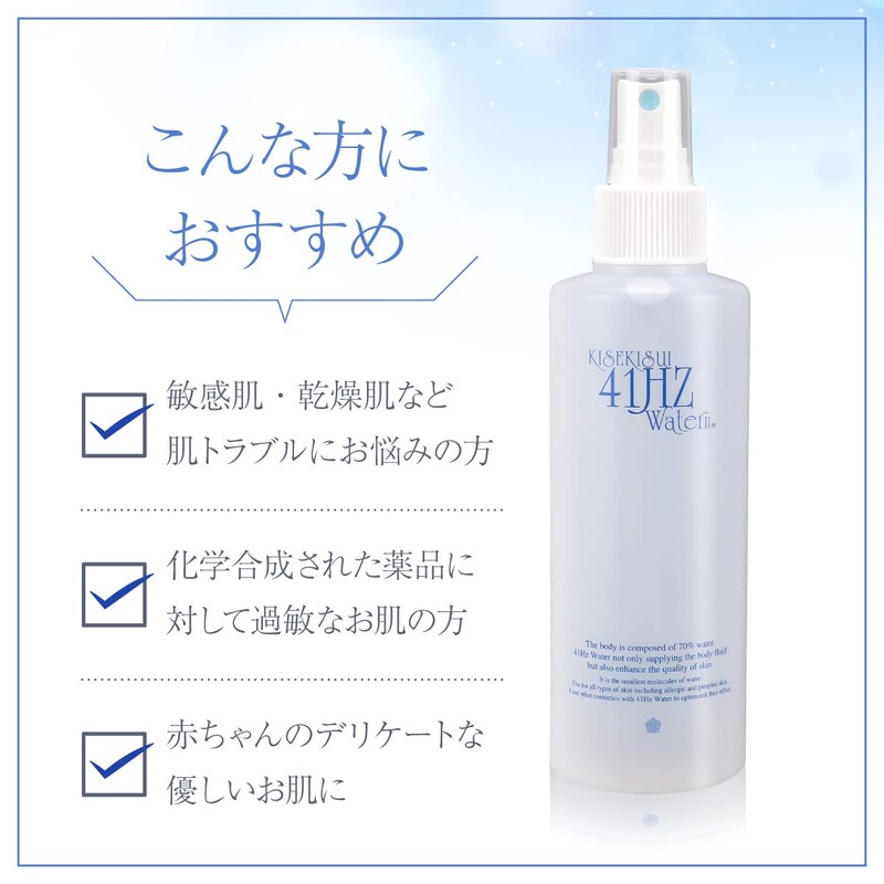 - 【セット内容】キセキスイ41ヘルツウオーター×1本 【内容量】200ml 【使用期限】開封後1ヵ月以内を目安にご使用ください。 【成分】精製水※合成界面活性剤、鉱物油、合成ポリマー、化学合成の防腐剤・酸化防止剤・色素・香料ほか添加剤は一切無添加 。アルコールも不使用 【使用方法】乾燥などが気になる素肌・髪・全身の水分補給に、たっぷりめにスプレーをかけてください。 【保管方法】直射日光を避けてなるべく低温又は冷温の場所に保存してください。 【使用上の注意】お肌に合わない時や異常を感じたときは、ご使用をお止めください。