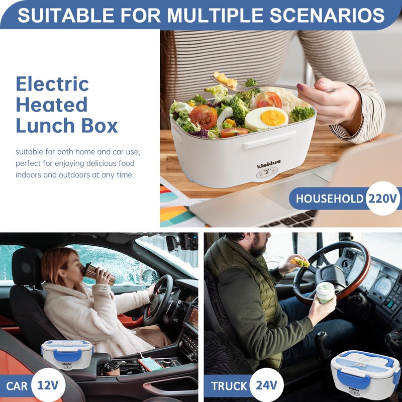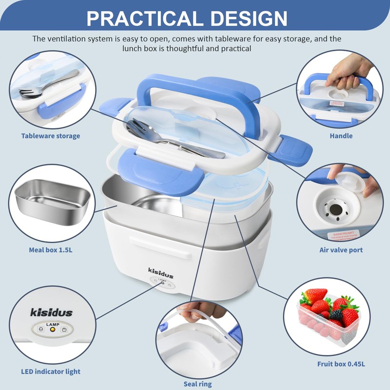kisidus Electric Lunch Box 3-in-1, 1.5L Stainless Steel Food Container, Portable Warming Container for Food for Household and Car, with Fork & Spoon (Blue)