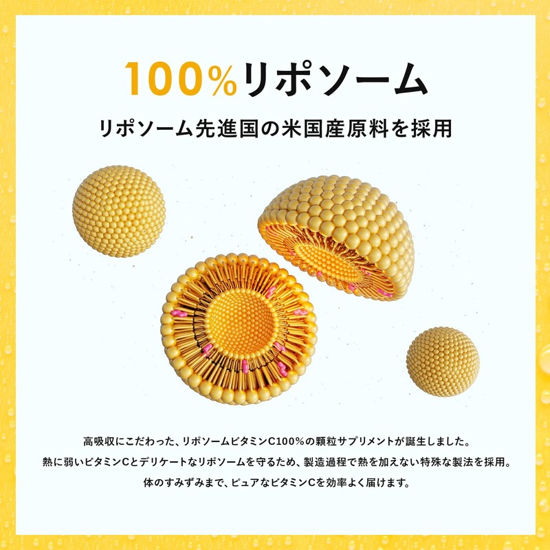 - 【先進のリポソーム技術によるビタミンC】 美容や健康を支えるビタミンC。このサプリメントでは、厳選された米国産高純度リポソームビタミンC原料を採用しています。リポソームは、体への吸収効率を高めることを目的とした特殊な技術です。この技術により、1包あたり1150mgのビタミンCを、リポソームビタミンC換算で1640mgとして配合。毎日のリズムを整え、活き活きとした毎日を送りたい方をサポートします。ビタミンCは、体のコンディションを支え、健やかな状態を保つのに役立ちます。