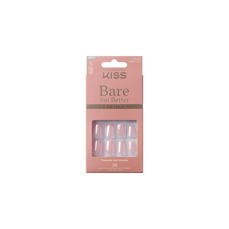 KISS Bare but Better Press-On Nails with Nail Glue 'Intro' Pink Short Squoval Shape, Contains 30 Nails, 2g Glue, 1 Manicure Stick, 1 Mini File