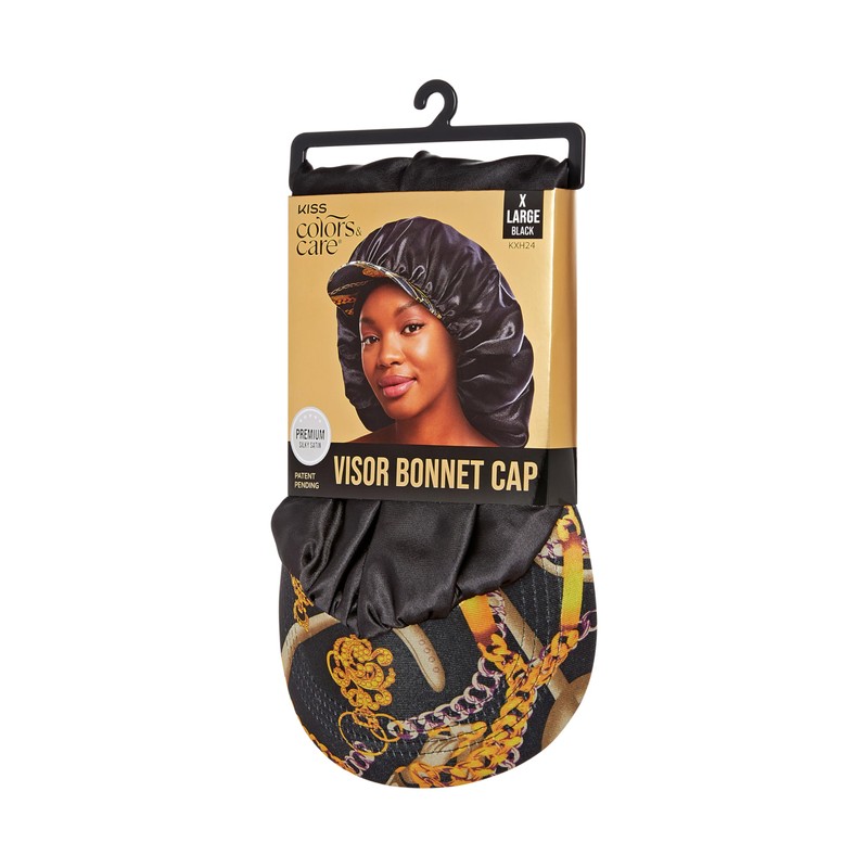 KISS Colors & Care Premium Silky Satin Fashion Visor Bonnet Cap, Patent Pending Hybrid Design, Double Layered Silky Satin Fabric, Wide Edge Elastic Band, Lightweight - XL Black