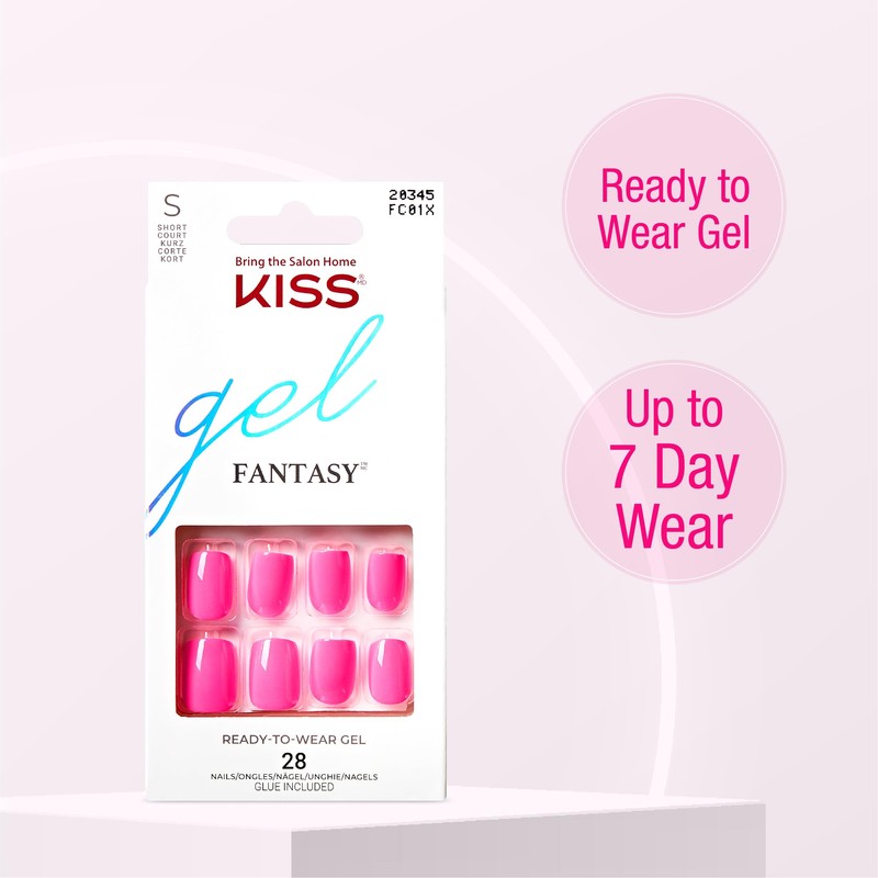 KISS Gel Fantasy 28 Pcs Press On Nails, Short Squoval Fake Nails, Neon Hot Pink Ready to Wear Gel Stick On Extensions, Reusable Full Cover Kit with Glue, Manicure Stick & File, Wear for 7 Days