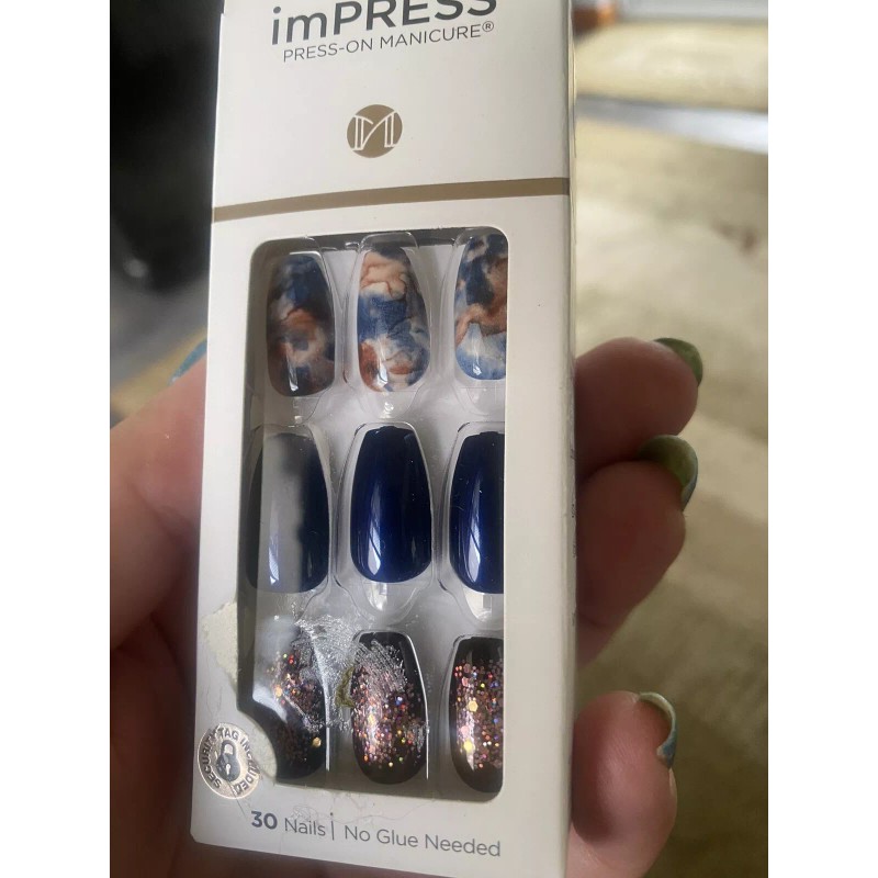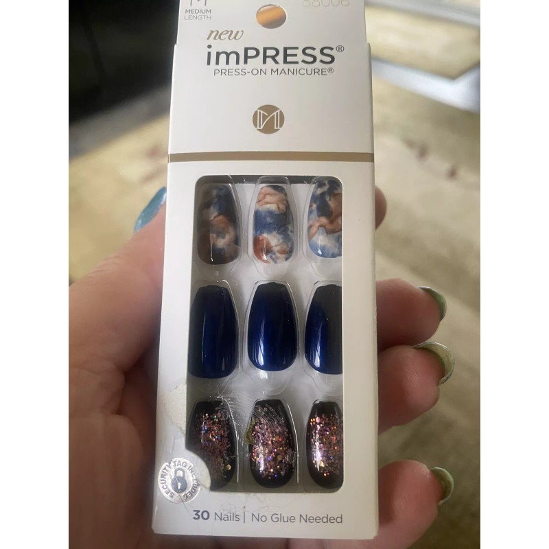 Kiss IMPRESS PRESS ON NAILS 30 MEDIUM INDIGO AUTUMN COFFIN SHAPE BLUES SHINY NEW