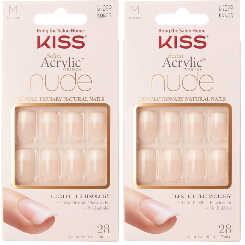 KISS Salon Acrylic Press On Nails, Nail glue included, 'Cashmere', French, Medium Size, Squoval Shape, Includes 28 Nails, 2g Glue, 1 Manicure Stick, 1 Mini file (Pack of 2)