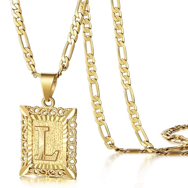KissYan Initial Letter Pendant Necklace for Men Womens, 14K Gold Plated Square Capital Monogram Necklace Silver Alhpabets from A-Z Figaro Chain Necklace(Golden 003L)