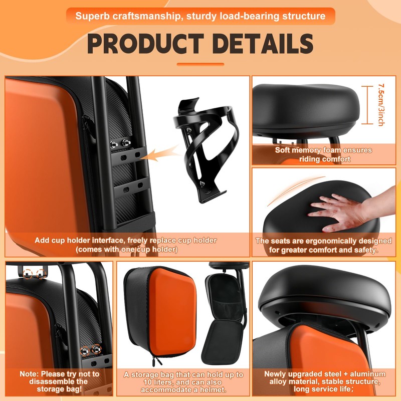 - Ultimate Comfort & Storage: Transform your scooter into a comfortable ride with our ergonomic seat, featuring a spacious 10L storage bag for your essentials. Perfect for daily commutes, errands, or leisurely rides, keeping your belongings secure and accessible.
