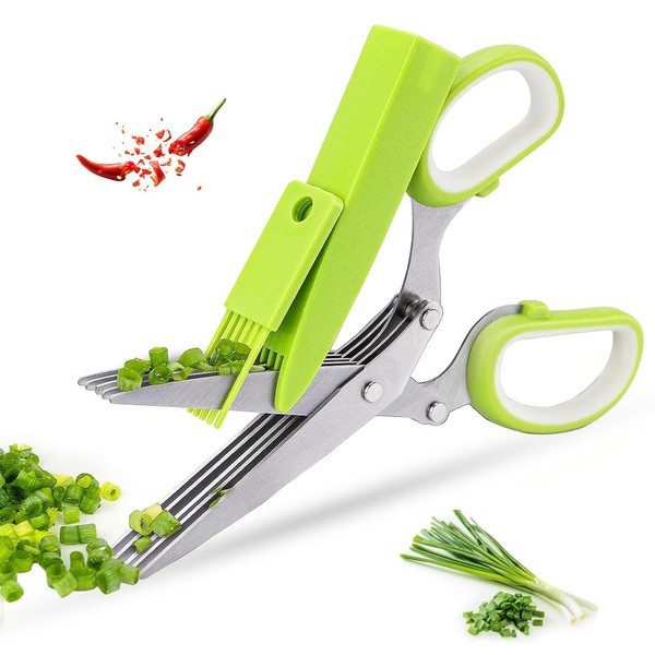 KISUOMAOYI Herb Scissors,Kitchen Scissors Multifunctional 5 Blade Kitchen,Scissors with Lid and Cleanup Comb,Stainless Steel Shears for Chopping Chives and Parsley(Green&White)