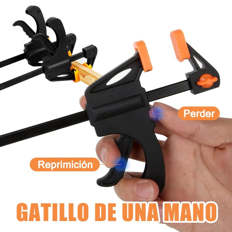 - 【Abrazadera F para carpintería】La abrazadera para carpintería es fácil de usar. Es fácil de sostener y se puede operar con una mano. Hay un gatillo de liberación rápida en la parte superior, ajuste el botón de liberación rápida y tire de la varilla de empuje para sujetar o liberar. El diseño del clip de goma suave antideslizante puede sujetar su proyecto firmemente, y las almohadillas de goma suave garantizan que su proyecto no se dañe y brindan una excelente estabilidad y protección.