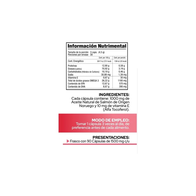 Cada cápsula contiene: 1000 mg de aceite natural de salmón de origen noruego y 10mg de vitamina E (Alfa tocoferol)