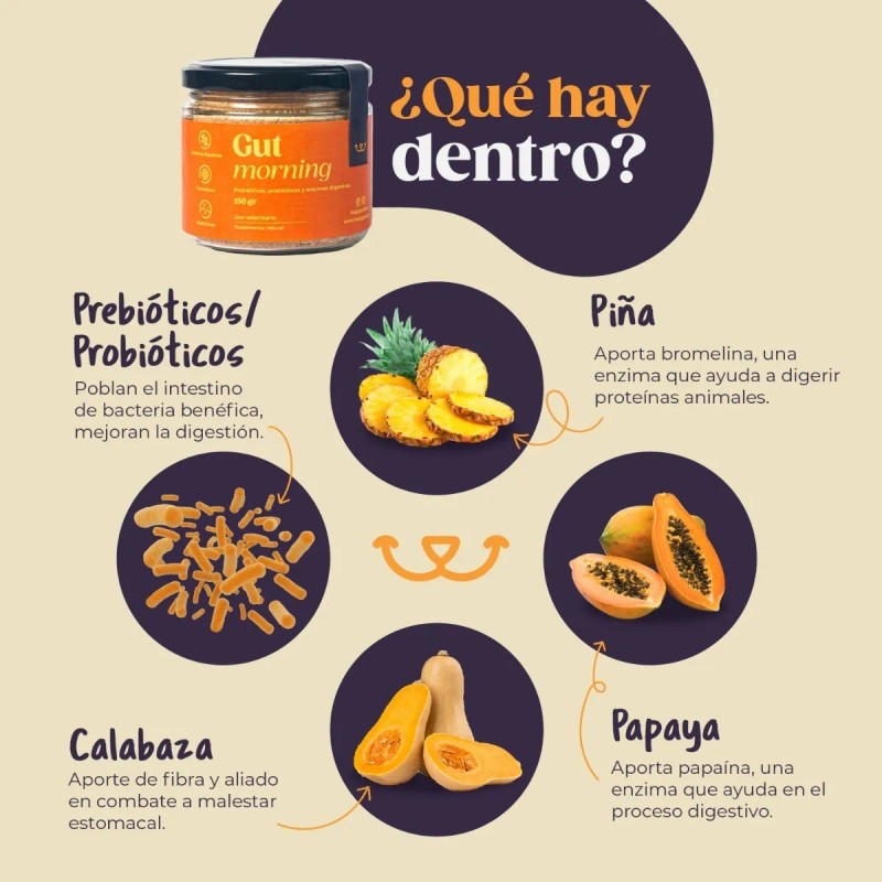 Contiene 3 suplementos: Omegapet Aceite de Sardina, Happy Boost y Gut Morning