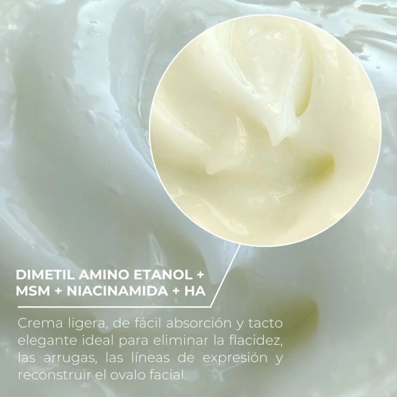 Formulado con ingredientes de vanguardia como DMAE, GABA, MSM y Ácido Hialurónico de triple peso molecular, este tratamiento redefine los contornos faciales, suaviza las líneas de expresión y mejora la elasticidad de la piel. La textura ligera y sedosa de nuestros productos asegura una hidratación profunda sin dejar sensación grasa, dejando tu piel revitalizada y con un acabado sedoso.