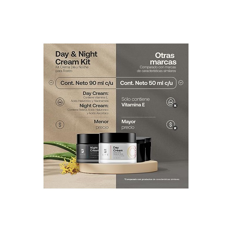 Kit Crema Da y Noche para Rostro de 90 ml CU. Ingredientes Naturales. Adicionada con Vitamina C y cido Hialurnico. Kit Day and Night Cream B Life.