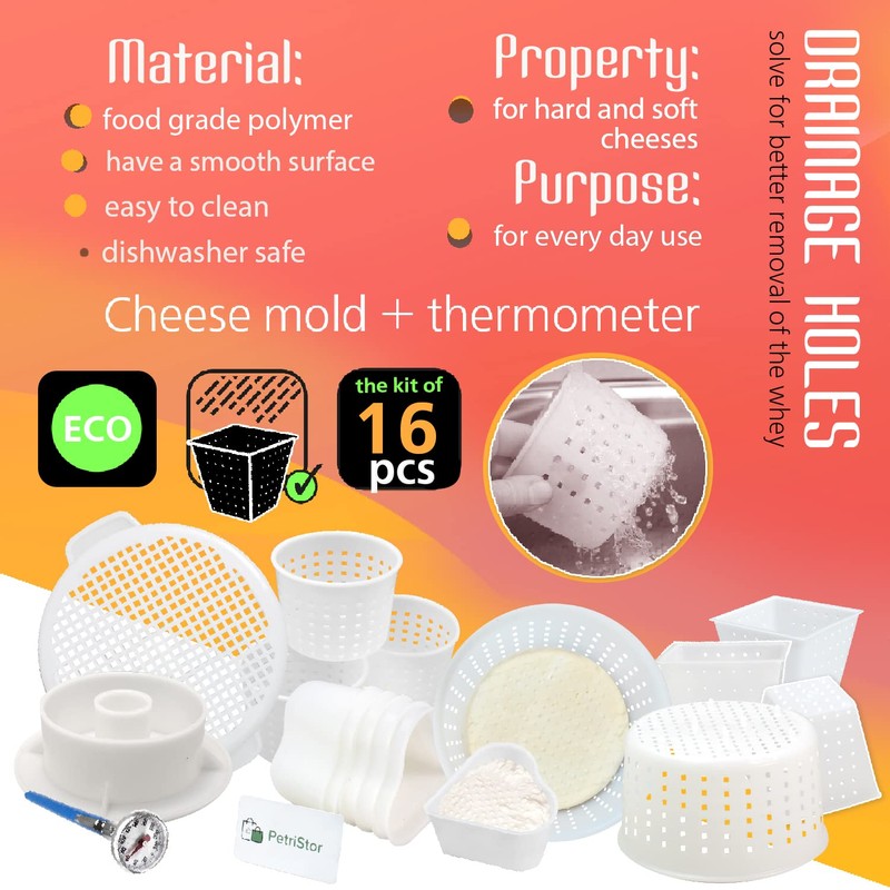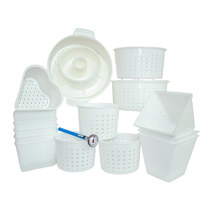 - Formas de queso para hacer quesos duros y suaves de leche de vaca, cabra y oveja: Mozzarella, Maskrapone, Brie, Parmesano, Cambocola, Camembert, Gorgonzola, Tete de Mouans, Roquefort, Bocconcini, Burrata, Grana Padano, Castelmagno, Cachotte, Ricotta, Talejo, Beaufort, Valenz3ouda, mamamamamaAsdam, Mildziter, Manchego, Radamer, Suluguni, Cachotte, Parmesano, Dor Blu, etc.