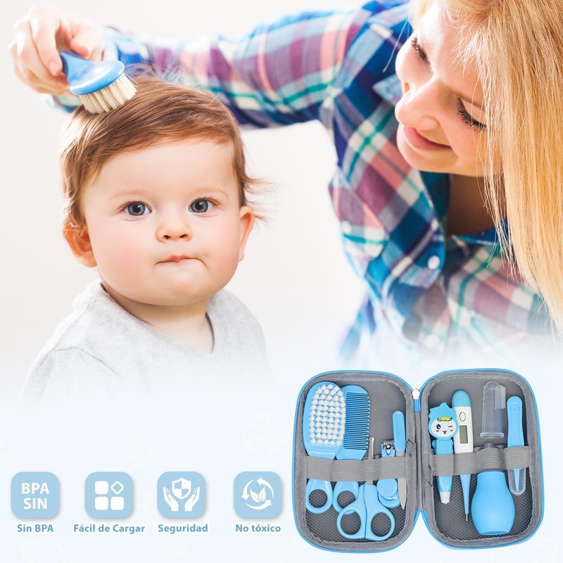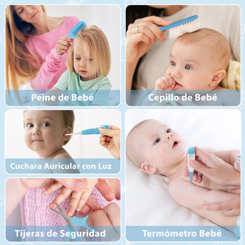 - 【Kit de Cuidado del Bebés 10 en 1】El kit de aseo y cuidado para bebés es un juego portátil y completo que incluye cuchara auricular con luz, pinzas para bebé, cepillo de bebé, peine de bebé, tijeras de seguridad, cortaúñas bebé, lima de uñas de bebé, cepillo de dientes, aspirador nasal, termómetro bebé. Este kit de cuidado de la salud del bebé hecho de sin BPA. Es adecuado para la limpieza diaria y el cuidado de la salud de recién nacidos, bebés, niños.