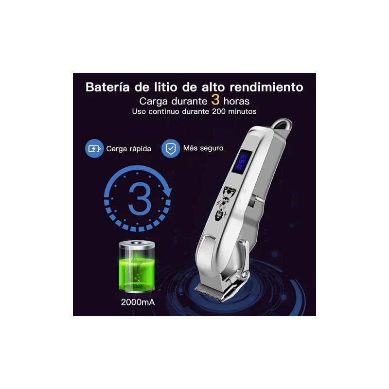 Está equipada con una batería recargable de 2000mAh, que le da un máximo de 200 minutos de capacidad operativa sin parar cuando está completamente cargada. Esta maquinilla para cortar el pelo se puede utilizar mientras se carga con el adaptador de voltaje 110-220.